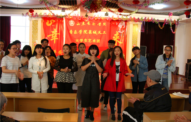 “青”力奉献 关爱弱势群体 ——山艺音乐学院“泉城义工”在行动 山歌、海笑、花飞扬,莺吟、燕舞、草清香。为学习贯彻习近平总书记系列重要讲话精神,将习近平总书记系列重要讲话内化为青年的精神追求,外化为青年的自觉行动,培养团员青年在大学生中领导思想政治正风向,积极响应校团委在全校团学组织中开展的“两学一做一争”活动的号召,山东艺术学院音乐学院“泉城义工”大学生艺术团于4月16日来到了济南市风合家人老年公寓,在红情绿意的春日为老人们带去精彩的节目和真挚的祝福。