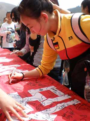 活动现场,伴随着响亮的山艺校歌,几千名来自不同院系的同学在鲜艳的条幅上亲手签下了自己的名字,用一颗颗诚挚的心筑起了一道宏伟的安全意识长城,使全院师生心手相连,共同促进了和谐校园的建设。