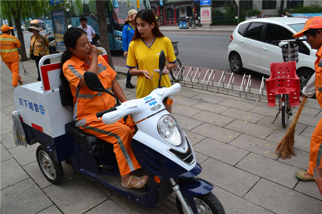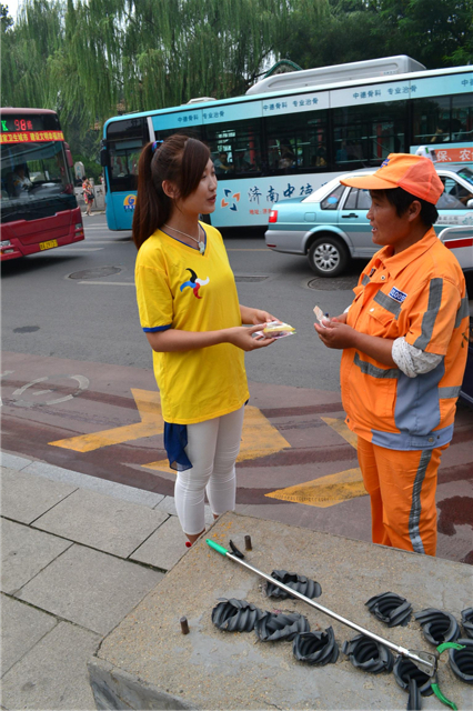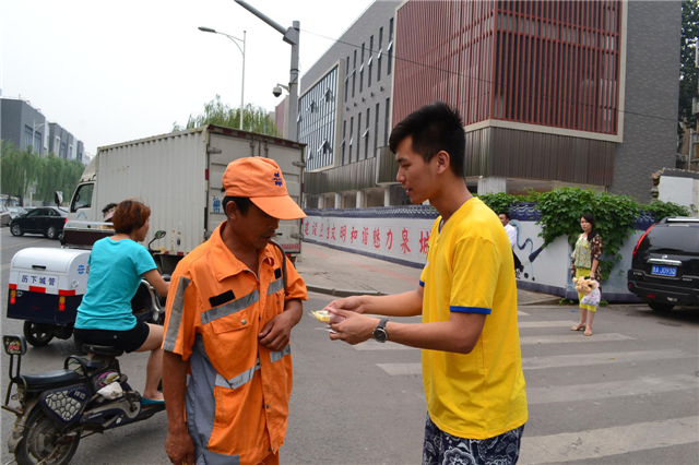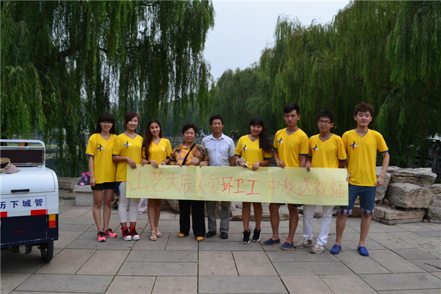 本站讯9月8日正值中秋佳节,山东艺术学院大辰公益社团的志愿者在学院的支持下,来到了济南市大明湖正门与曲水亭街周边,为在进行环境市容打扫的环卫工人们送上了月饼、贺卡,真挚的慰问祝福。志愿活动缓解了环卫工人们工作压力,也为他们带来了佳节的喜悦。