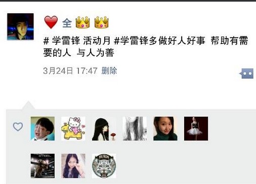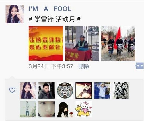目前微信深受广大同学的欢迎,同学中大多数都是微信的忠实用户,我院充分利用这一新的传播媒介,在微信上设立了公共账户,开展宣传活动。雷锋月期间,我院更是充分利用微信平台,发布实时活动消息,号召广大学生在网络上发布身边关于弘扬雷锋精神的图片和事迹,“晒”出身边的活雷锋,传播正能量。并且及时收集整理、发布同学们的投稿,拉近与同学们之间的距离,调动同学们参与活动的积极性,充分利用新媒体平台引导同学们认知和弘扬雷锋精神,提高活动的影响力。