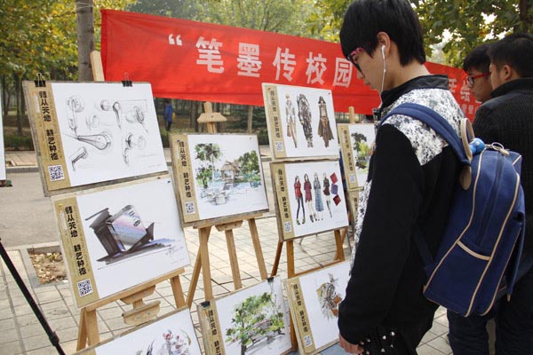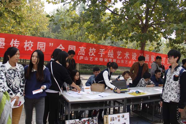 为丰富校园文化生活,提高专业技能水平,10月23日中午,由设计学院学生会社团部、庐山艺术特训营暨山东艺术学院汇集天下手绘社团组织的主题为“笔墨传校园”的全国高校手绘艺术设计交流巡回画展在我校食堂门口开展了交流活动。