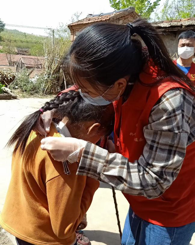马家庄站的活动给自己的内心留下了最为深刻的记忆。入户帮扶时,我遇到了一个特殊的小女孩,她们这一类孩子有一个特别的名字——星星的孩子,女孩天生患有自闭症,虽无法进行正常的语言表达,却有着最美好的内心。当我意识到她一直目不转睛地盯着我胸前的一条装饰链时,便知晓在她的身上也有女孩爱美的天性,我将装饰链摘下并给她戴上,她兴奋极了,一声又一声模糊不清的说着什么,当我被告知她是在叫我“姐姐”时,在高兴地同时也被这个特殊的孩子打动了,她们的快乐是如此简单。