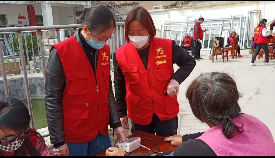 此次活动的第一站在淄川区太河镇峨庄村。在村委前的广场上我们架起了桌子,设置了“爱心磨刀” “医疗服务”“家电维修”“爱心理发”“爱心修脚”“爱心护眼”等六个服务区域。我负责记录志愿服务信息、为老人测量血压、参与入户帮扶并送上爱心大礼包。由于疫情期间长时间的封闭隔离,村里年长者的食物资源也相对匮乏,因此爱心大礼包里主要是新鲜的水果、蔬菜、油、米、面,为老年人的基础生活提供一定的保障。