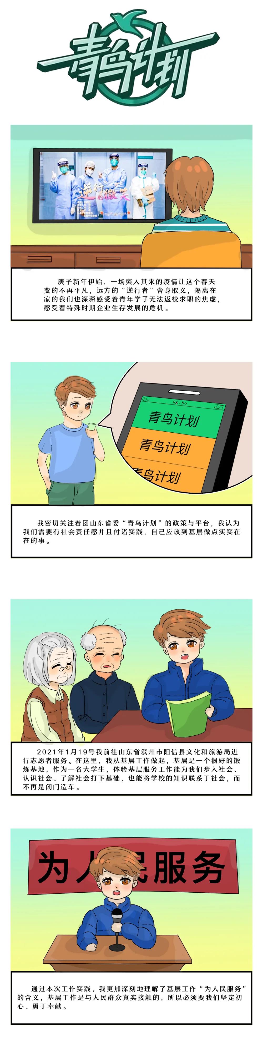 来自山东艺术学院的史铭泽同学,一直有着为阳信城市建设和经济发展尽一份力的心愿,他在平日里时刻关注着山东省委"青鸟计划"的相关政策和平台,最终找到了自己心仪的岗位,在山东省阳信县旅游文化事业发展中心参与了一系列工作。