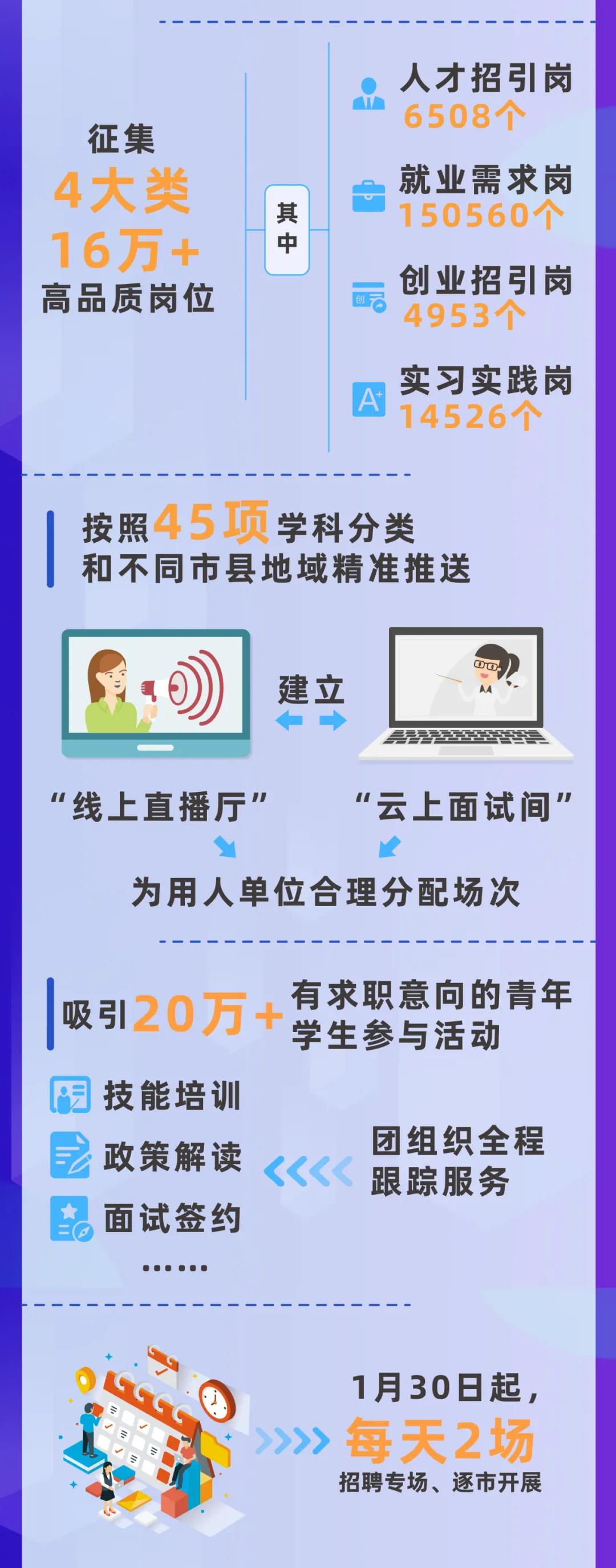 1月30日起,省市县三级团委、152所高校和100余处省外高校“青鸟驿站”联动,将采用省级设主会场、16市和县(市、区)设分会场的形式,连续举办16场专场活动,集中宣传我省人才政策,推介青年驿站等一站式服务平台,组织用人单位通过“线上直播厅”“云上面试间”与应聘学子进行面试、答疑。