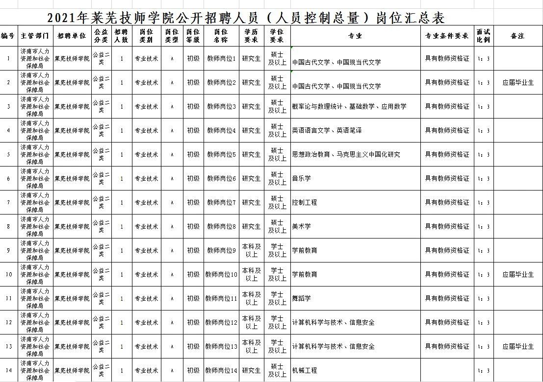 2021年莱芜技师学院公开招聘人员(人员控制总量)岗位汇总表