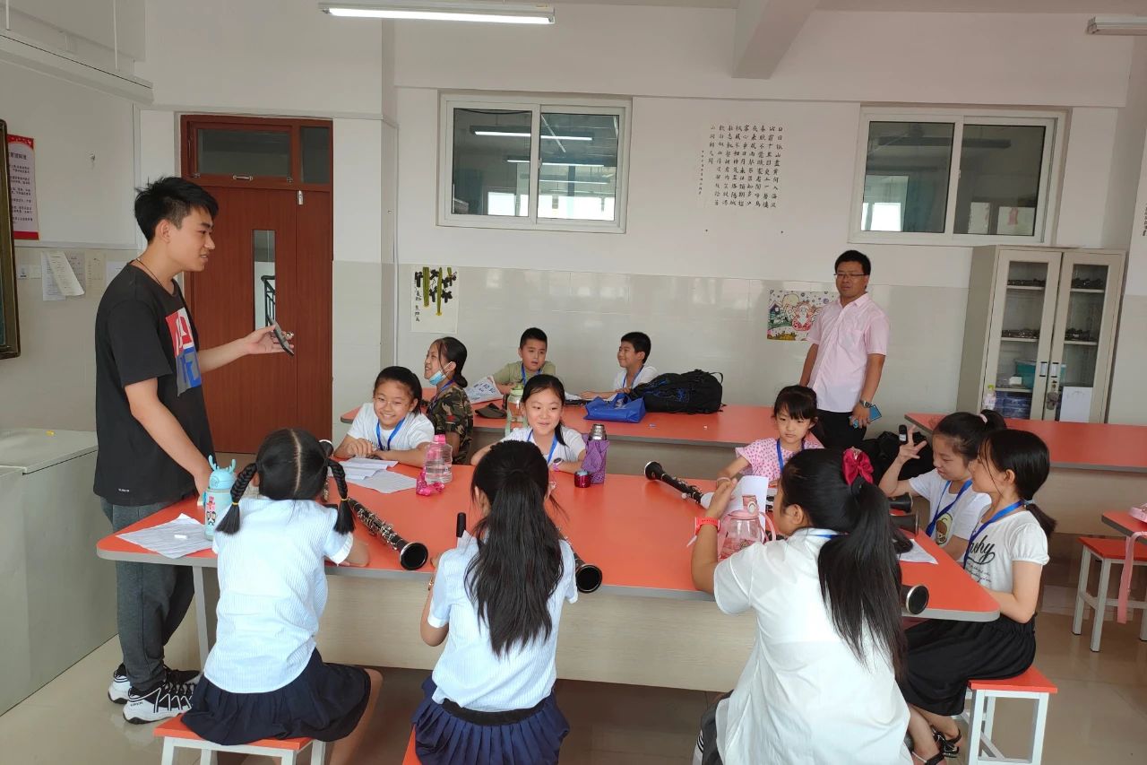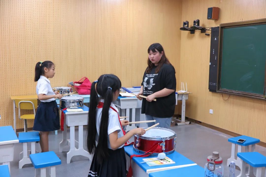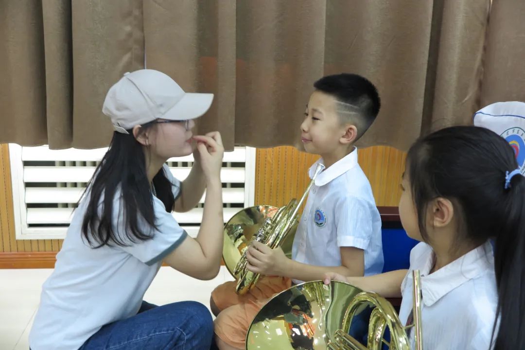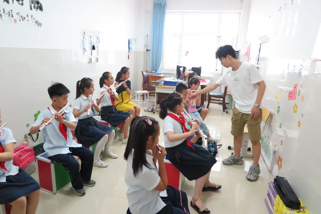 开营仪式后,支教活动随即展开,包括小号、长笛、圆号、单簧管、长号、打击乐、萨克斯专业在内的“泉城义工”大学生艺术团的同学们也正式担任起了老师们的责任。在每一间教室中,都能看到他们孜孜不倦的身影,他们鼓励着孩子,为孩子们传授知识、点拨技艺,一遍又一遍的给孩子们示范、排练;孩子们也都认真跟随老师的指导,逐步改正技术上的问题,浑厚悠扬的管乐声回荡在东关小学校园的每个角落。