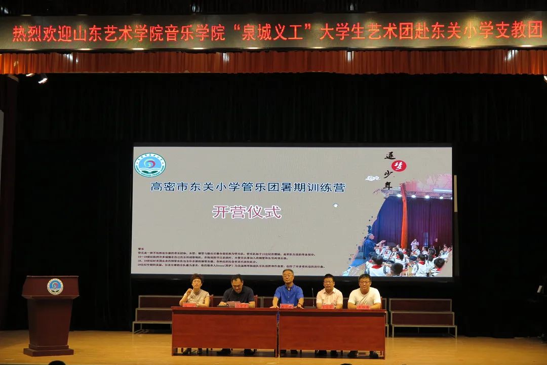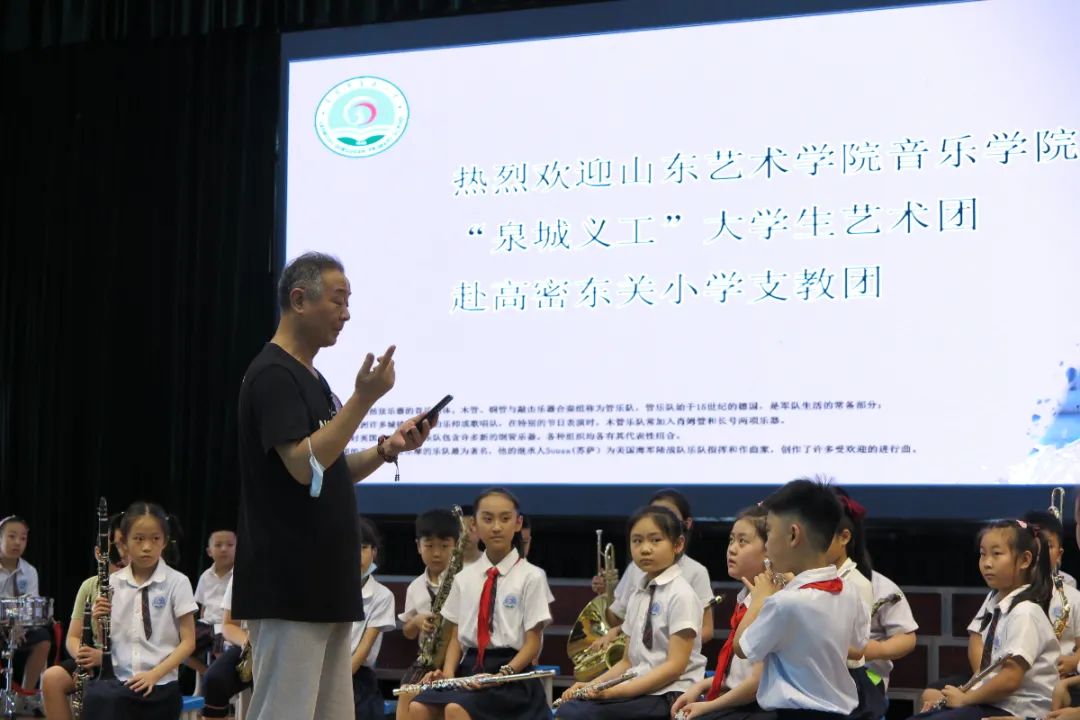 根据团省委《关于印发开展2021年全国大中专学生志愿者暑期文化科技卫生“三下乡”社会实践活动的通知》要求和校团委工作安排,为组织引导广大青年学生深入社会、了解国情、接受锻炼,在实践中厚植爱党、爱国、爱社会主义的情感,增强服务社会的意识和本领,以实际行动庆祝中国共产党成立100周年,音乐学院 “泉城义工”大学生艺术团“三下乡”社会实践赴高密市东关小学开展支教活动。7月13日,高密市东关小学管乐团暑期训练营开营仪式在该校报告厅举行,随即拉开艺术团为期3周的支教活动。中国音乐家协会会员、山东省音协管乐专业委员会会长、山东艺术学院教务处原处长聂立家教授,东关小学校长孙常青,山东艺术学院音乐学院党总支副书记王志军、正科级辅导员王维海,管乐团学员及其家长参加开营仪式。开营仪式由东关小学副校长赵娟主持。