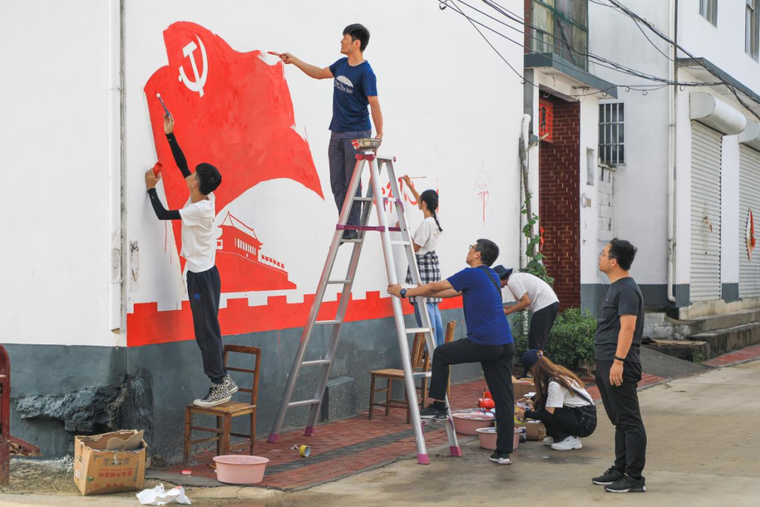 青绘美丽乡村,助力乡村振兴。7月27日,社会实践团到达薛城区西丁桥村,开展“青绘美丽乡村 助力乡村振兴”墙绘活动。为确保墙绘作品质量,社会实践团特别邀请设计学院青年教师张恒旺作为指导教师进行现场创作指导。结合西丁桥村负责人的要求和该村村容村貌,实践团调整、确定了墙绘关键词为“红色文化”“新时代”“生态环境”。实践团成员根据墙绘任务分为4个小组,小组成员分工明确、各司其职,大家充分发挥各自的专业优势,一手握着画笔,一手捧着颜料,构图、起稿、填色到画面的整体调整……一幅幅构思巧妙、通俗易懂的墙绘作品跃然墙上,形成了以“永远跟党走”为主题的红色长廊和以“绿水青山就是金山银山”的绿色长廊,一红一绿两大主题、一南一北两条主干道,交相辉映,把乡村装扮得更加美观大方的同时,也提高了村民的精神文化生活品 味。墙绘活动受到了当地村民的关注,对实践团的专业水准和辛苦付出不停点赞,并纷纷在完成作品面前拍照留念。