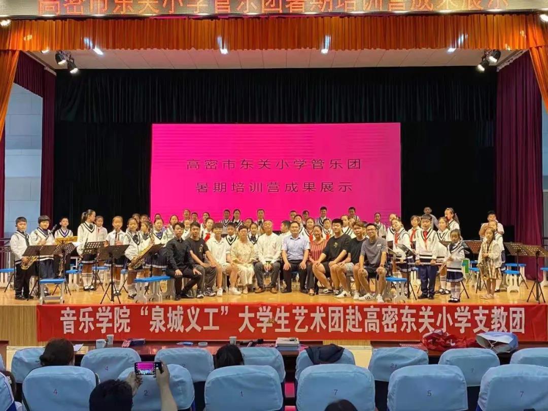 根据团省委《关于印发开展2021年全国大中专学生志愿者暑期文化科技卫生“三下乡”社会实践活动的通知》要求和校团委工作安排,为组织引导广大青年学生深入社会、了解国情、接受锻炼,在实践中厚植爱党、爱国、爱社会主义的情感,增强服务社会的意识和本领,以实际行动庆祝中国共产党成立100周年,音乐学院 “泉城义工”大学生艺术团“三下乡”社会实践赴高密市东关小学开展支教活动。7月30日,经过3周的教学后,支教汇报演出在东关小学报告厅举行。中国音乐家协会会员、山东省音协管乐专业委员会会长、山东艺术学院教务处原处长聂立家教授,东关小学校长孙常青、副校长赵娟,音乐学院“泉城义工”大学生艺术团支教成员,东关小学管乐团学员及其家长参加活动。