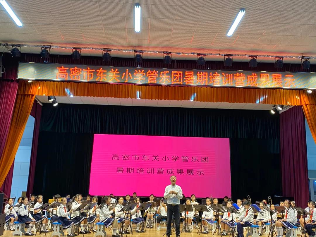 随后,在聂立家的指挥下,东关小学管乐团培训营的同学们进行了成果展示,演奏了《太阳出来喜洋洋》以及多个练习曲。同学们动作整齐划一、协和悠扬的管乐声飘荡在每个人的心间,汇报演出暨支教活动在大家热烈的掌声中圆满结束。