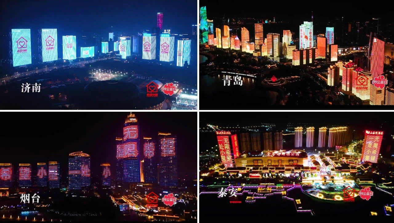 济南绿地中心、青岛浮山湾……“99公益日”到来之际,山东共青团“希望小屋”公益广告在全省16市地标建筑集体点亮,漆黑的城市夜幕里,震撼的灯光、温暖的标语、动人的笑脸,瞬间抓住了所有人的眼球,成为各地街头最特别的一道风景。
