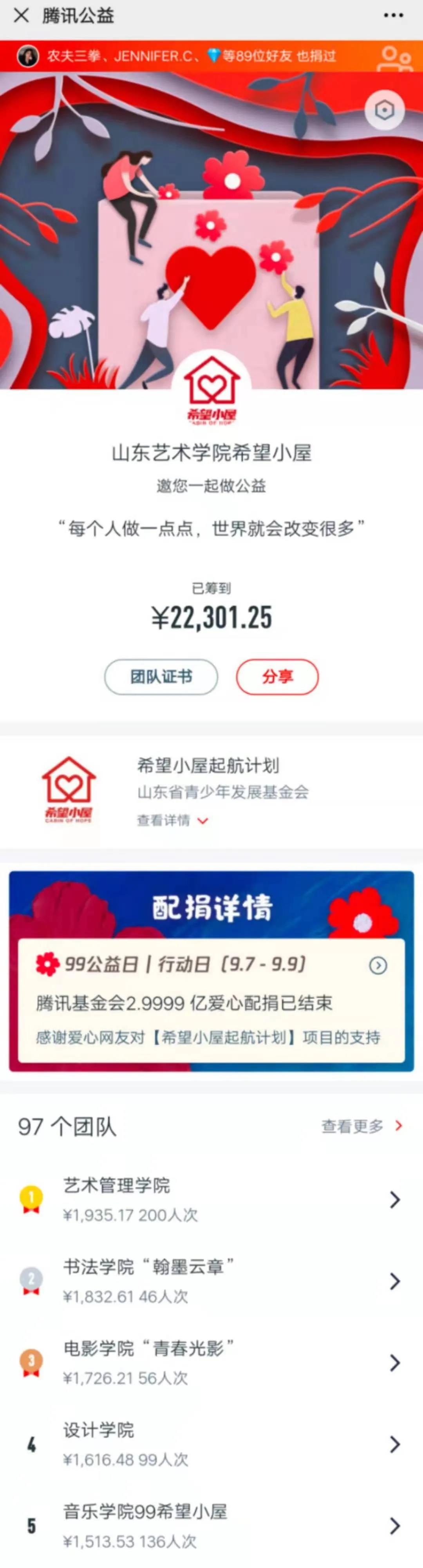 据悉,本次“99公益日”共有1546人次参与山东艺术学院“希望小屋”,组建“一起捐”战队97个,共筹集22301.25元,这些善款足以建设2个“希望小屋”,这就是山艺人!