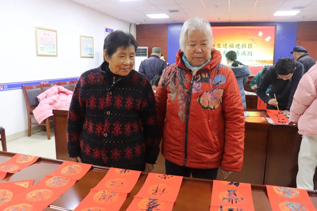 “千门万户曈曈日,总把新桃换旧符”。一幅幅火红的春联,既是对即将过去的一年最美的总结,也是对新的一年美好的期盼。当同学们将散发清新墨香的喜庆大红春联和“福”字送到老人们手中时,老人们一边欣赏同学们的书法作品,一边品评春联寓意,现场洋溢着欢乐祥和的气氛。红红火火的春联饱含着真诚的祝福,洋溢着浓浓的喜庆气息,传递着温馨的情调,为社区的老人们送上了一份美好的新年祝福。