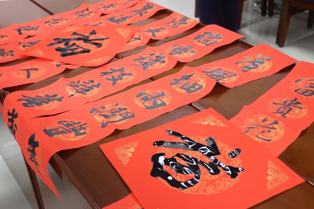 春联象征着吉祥,表达了人们对美好生活的向往。在2022年元旦来临之际,设计学院深入欣源社区,现场写春联、福字并免费赠送给社区居民。虽然天气寒冷,但同学们还是脱下大衣,挥毫泼墨,大显身手。“喜居宝地千年旺 福照家门万事兴”“福星高照全家福 春光耀辉满堂春”……活动现场墨迹飘香,沾了墨的毛笔在成员们的手中肆意挥舞,一幅幅充满喜庆、吉祥、祝福的春联和各式各样的福字跃然纸上。一行行俊逸的书法,一句句真诚的祝福,一笔一划中饱含了同学们对社区居民们真挚美好的祝愿,寄托着人们对新春的憧憬和向往。
