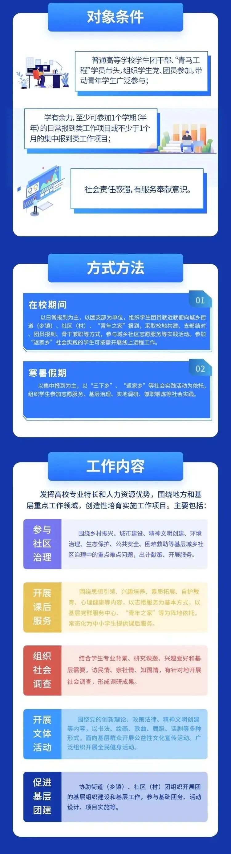 1. 在校期间:以日常报到为主,以团支部为单位,组织学生团员就近就便向城乡街道(乡镇)、社区(村)、“青年之家”报到,采取校地共建、支部结对、团员报到、骨干兼职等方式,参与城乡社区志愿服务等实践活动。参加“返家乡”社会实践的学生可按需开展线上远程工作。