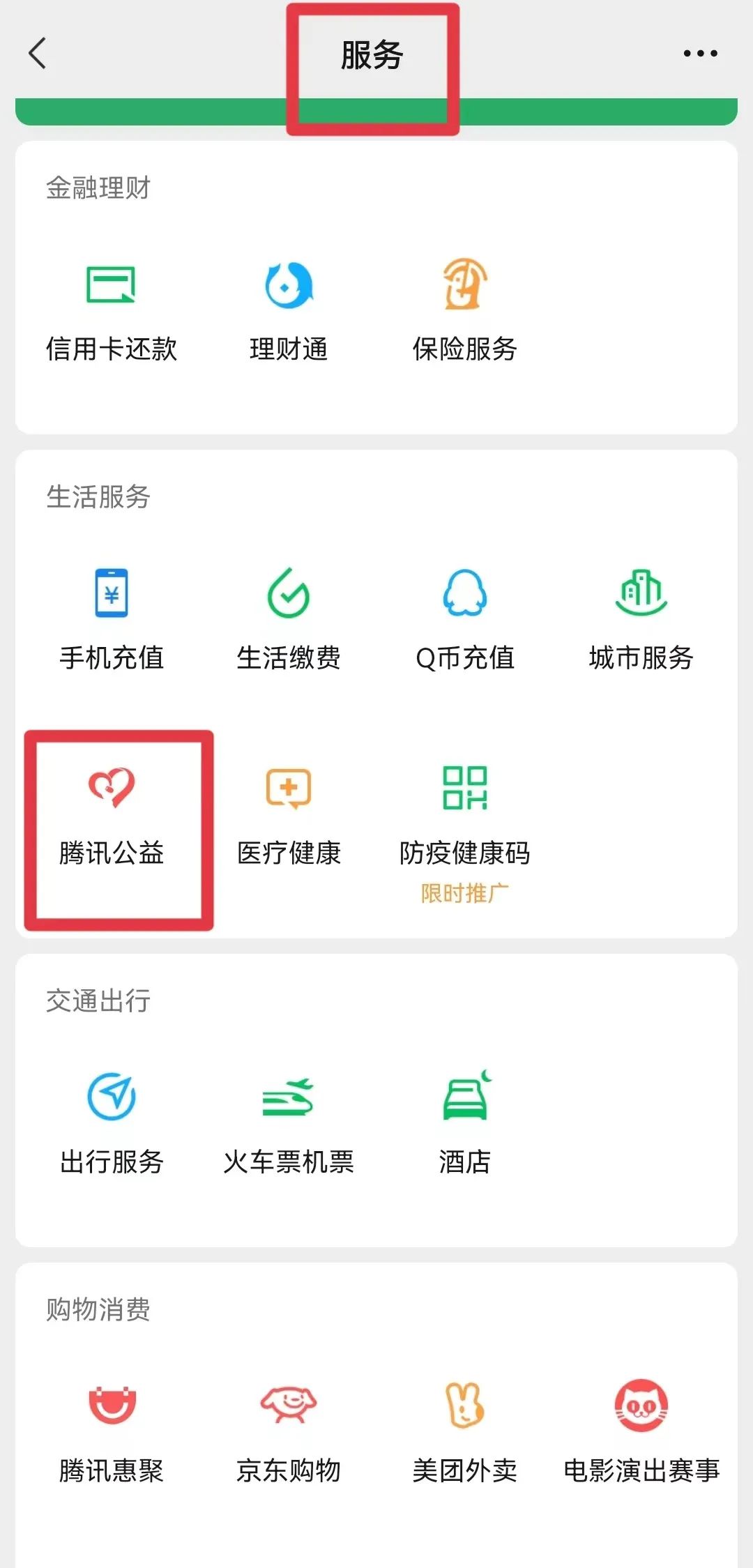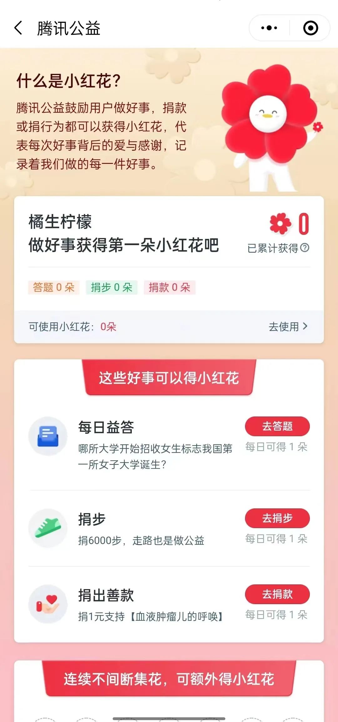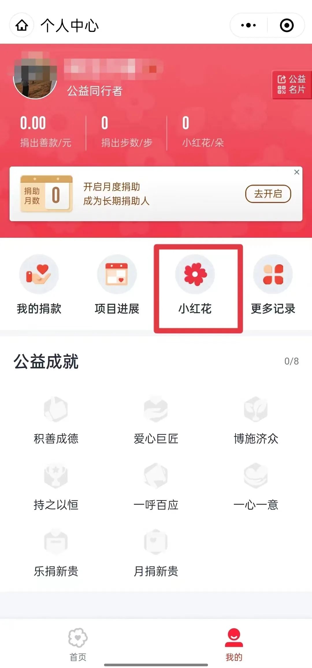 微信“我的”进入“服务”后,点击“腾讯公益”,进入“个人中心”,点击“小红花”按钮,即可根据提示获取小红花呦~