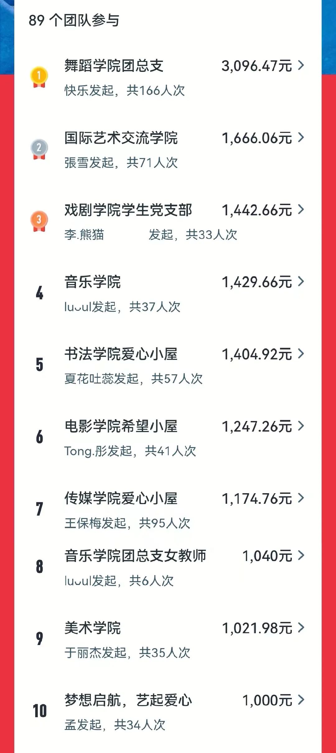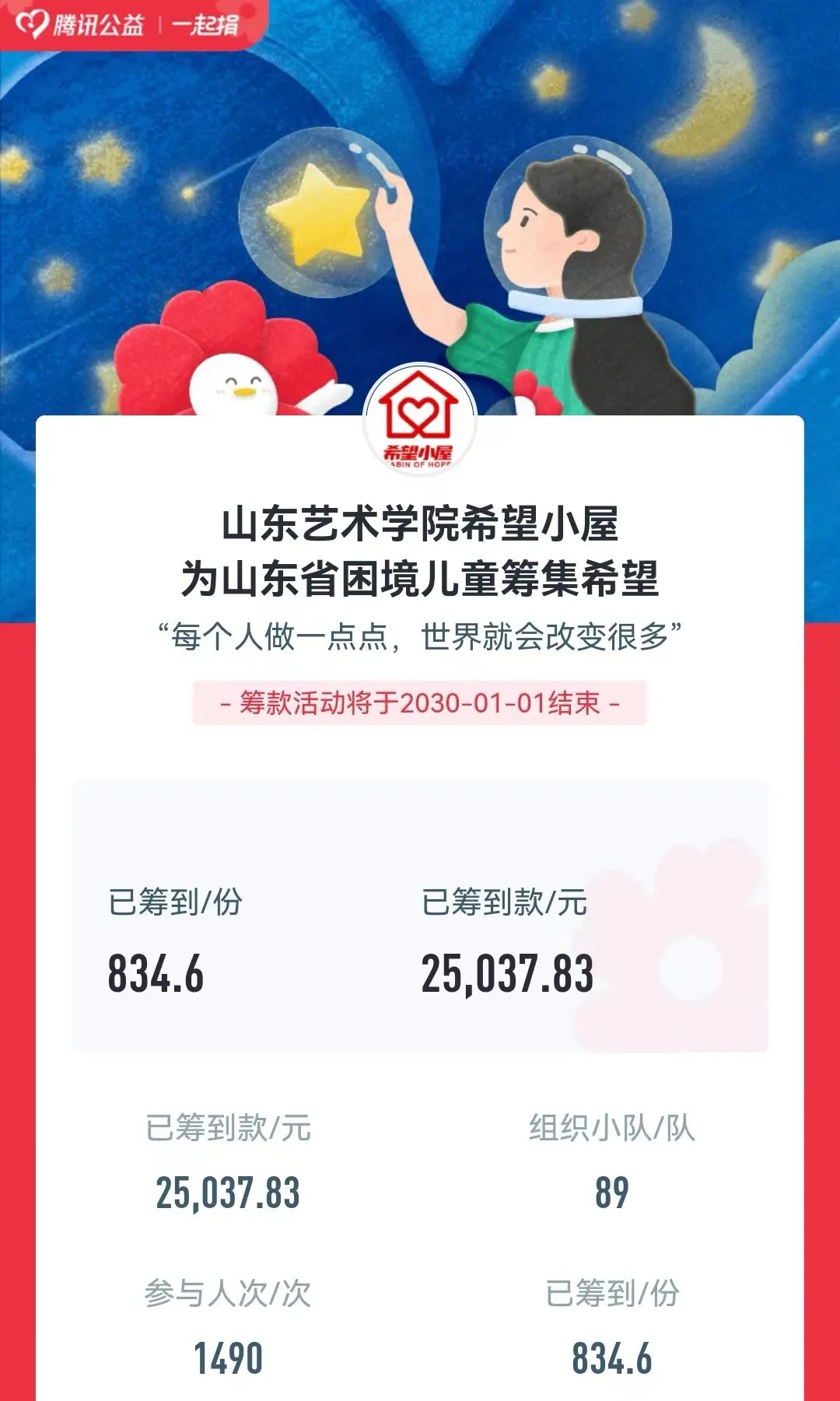 截至目前(5月25日21:00),山东艺术学院“希望小屋”520公益日共参与1490人次,组建“一起捐”战队89个,共筹集体善款25037.83元,为每一个山艺人点赞!