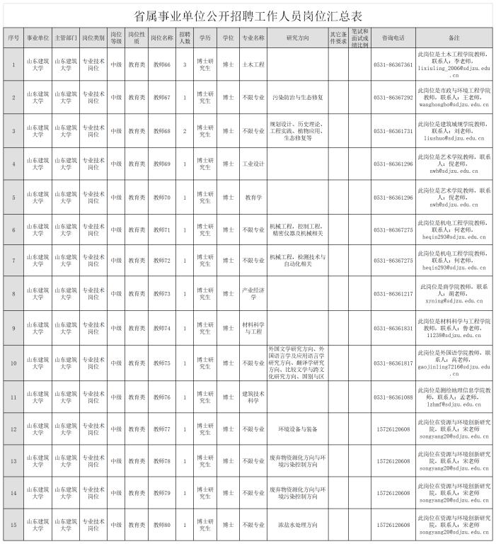 山东建筑大学拟面向社会公开招聘中级岗位工作人员18名。具体岗位及条件详见《省属事业单位公开招聘工作人员岗位汇总表》。