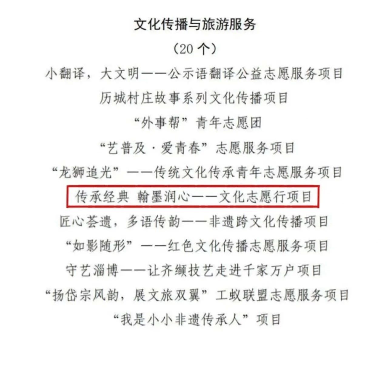 "传承经典 翰墨润心” ——文化志愿行项目,围绕“1234”模式开展志愿服务。一是始终以坚定文化自信、传承和发扬中华优秀传统文化为中心;二是坚持以党建带团建,服务学校和社区两个群体;三是逐步形成“宣讲+书法+篆刻”三个特色服务社团;四是打造了公益课堂、书法展览、文化考察和公益捐赠等文化志愿服务。先后开展公益课堂17期,书法展览8余次,捐赠书法作品近百余副,在“福送万家,暖冬行动”,书写春联30000余副,福字60000余张,将春节祝福送进千家万户,累计志愿服务时长4483.36小时。