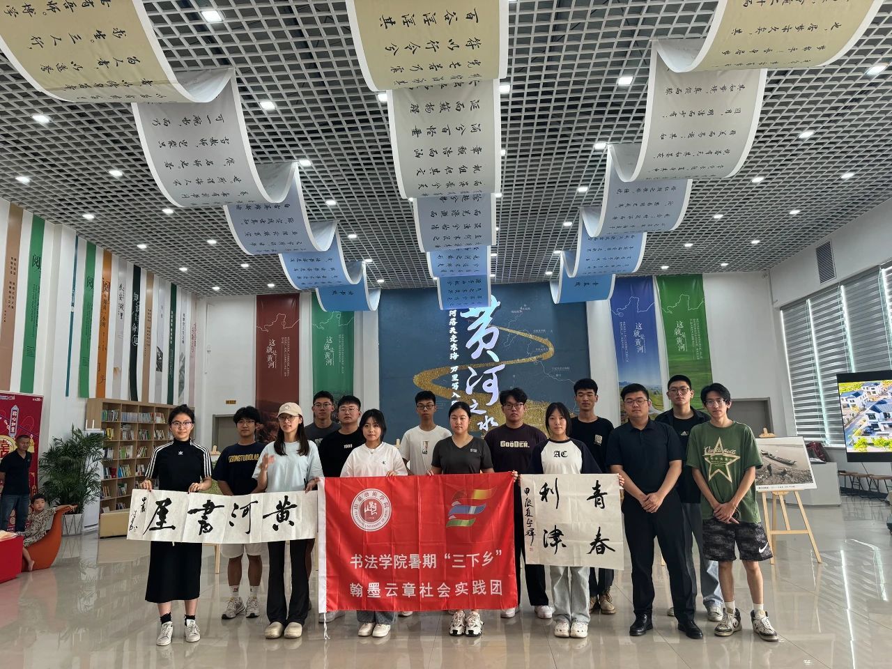 7月14日上午,实践团来到了利津县东津渡黄河书屋参观学习。 通过宣传片,同学们直观地感受到了黄河作为中华民族母亲河的壮阔与伟岸,以及它如何滋养了一方水土,孕育了丰富多彩的非物质文化遗产,展现了利津人民与自然和谐共生的美好图景。在黄河书屋中,同学们仿佛置身于一幅流动的历史画卷之中,书页间跳跃的是黄河文化的悠久与辉煌,窗外流淌的是中华民族生生不息的精神血脉。“黄河落天走东海,万里写入胸怀间”这种将自然美景与人文情怀紧密结合的沉浸式体验,无疑加深了同学们对黄河文化的理解和认同,激发了他们内心深处的文化自信与自豪感。随后,同学们以书法艺术形式为载体,创作了“九曲黄河万里沙”、“大美利津”、“青春利津”等作品,这不仅是对黄河美景的颂扬,更是对黄河文化精神的传承与创新。每一笔一划都凝聚着同学们对黄河文化的热爱与敬仰,也寄托了他们为传承和弘扬中华民族优秀传统文化、推动民族文化复兴贡献力量的决心与信念。