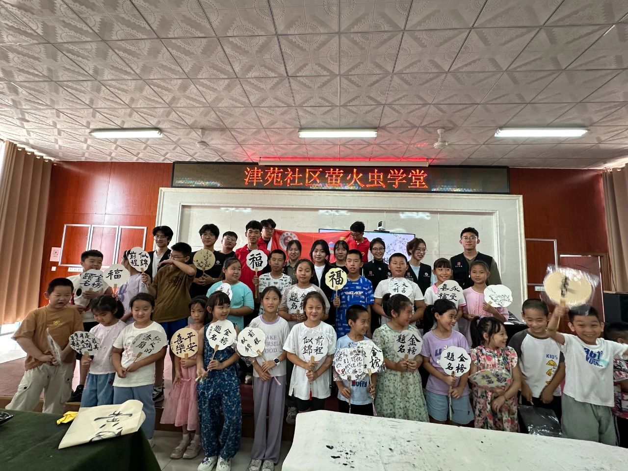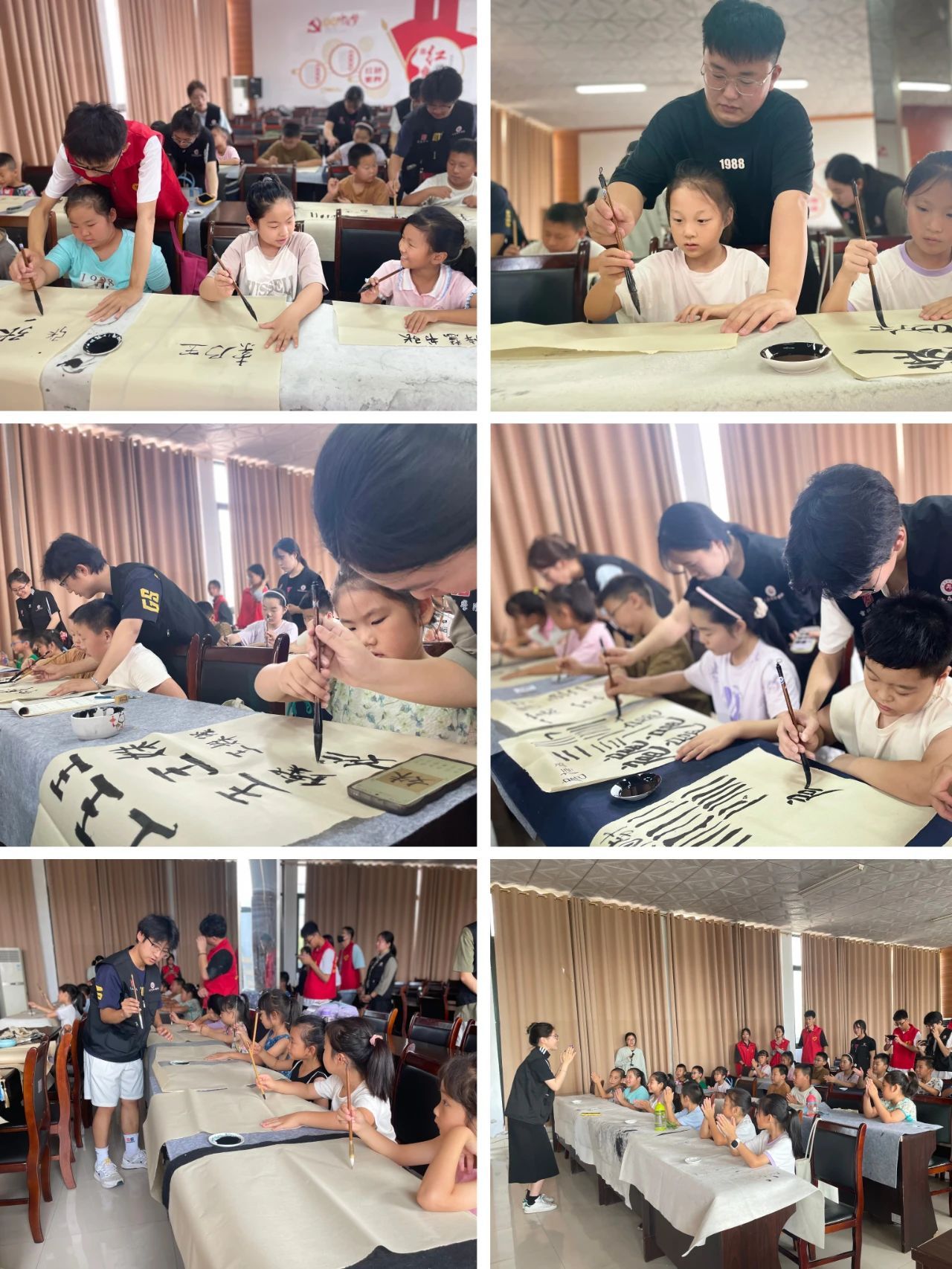 7月14日下午、15日上午,志愿者同学们先后在东津渡创新创业基地和津苑社区“萤火虫学堂”开展“闳美小课堂”公益支教活动。延安精神宣讲团的志愿者们以“半条被子”的温情故事与小兵张嘎的英勇事迹为引子,伴随着《闪闪红星》的悠扬旋律,为孩子们上了一堂生动的红色教育课,旨在引导孩子们传承红色基因,厚植家国情怀。随后志愿者以深入浅出的方式,带领孩子们穿越时空,探索书法的悠久历史,解析基本笔法之精妙,剖析字体结构之独特,并强调书法练习对心灵的滋养作用。通过生动的示范与趣味横生的讲解,原本对书法陌生的孩子们眼中闪烁起好奇与热爱的光芒。课堂上,孩子们全神贯注,跟随志愿者的指导,一笔一划间渐渐领略到书法的魅力,不仅掌握了书法的基础技巧,更在心中种下了对书法艺术深深向往的种子。此次活动不仅是一次知识的传递,更是一次心灵的启迪,激发了孩子们对传统文化的热爱与尊重。