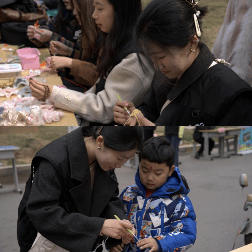 活动现场,志愿者们与居民一同沉浸在扭扭棒的奇妙世界,扭扭棒在大家手中不断变换形状。精致的手工针织品也吸引了居民们的眼球,更有不少小朋友向志愿者学习制作流程,欢声笑语回荡在社区的一隅。聚集在奶油胶发夹制作区的小朋友们也忙得不亦乐乎,选择自己喜欢的饰品,为自己制作出独一无二的发夹。这些充满想象力与奇思妙想的手工制品,不仅是小朋友们的创意结晶,更是他们快乐的见证。