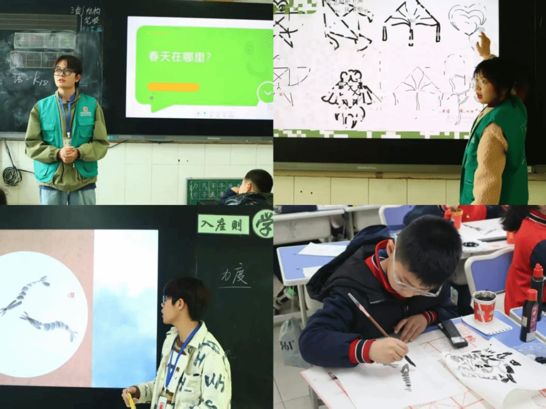 3月14日,恰值柳枝吐翠的阳春三月,“设计正青春”志愿服务团队携着斑斓色盘重返青杨小学。水彩与蜡笔在稚嫩指尖翩跹游走,将春日艳阳揉碎成七彩光晕定格画中。