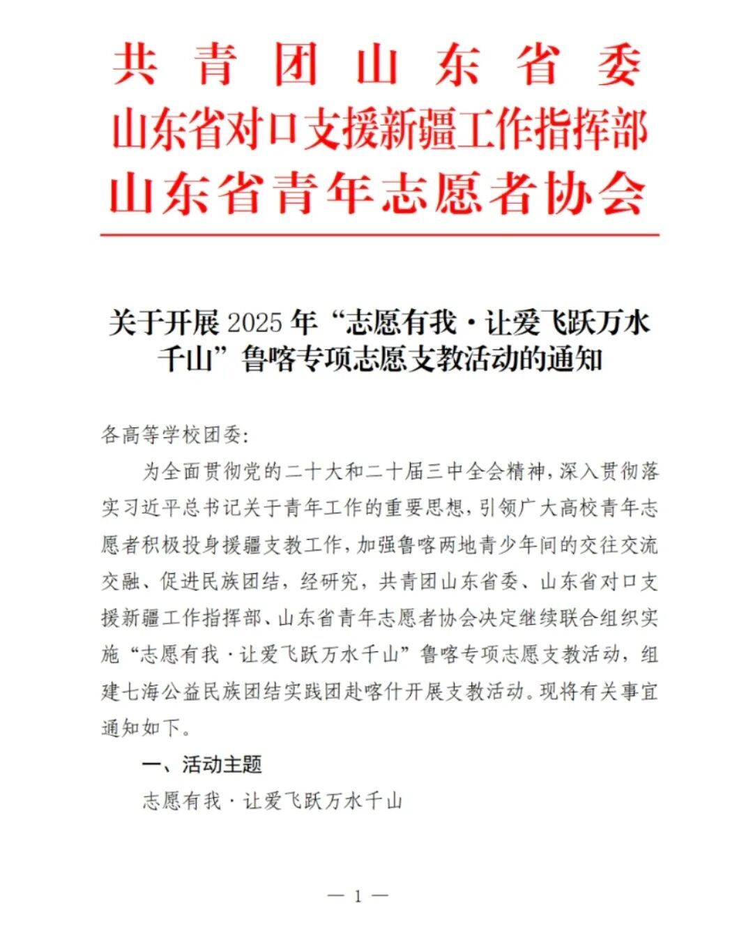为全面贯彻党的二十大和二十届三中全会精神,深入贯彻落实习近平总书记关于青年工作的重要思想,引领广大高校青年志愿者积极投身援疆支教工作,加强鲁喀两地青少年间的交往交流交融、促进民族团结,共青团山东省委、山东省对口支援援藏工作指挥部、山东省青年志愿者协会联合组织开展“志愿有我·让爱飞跃万水千山”鲁喀专项志愿支教活动,我校戏剧学院“亮音”语言艺术志愿服务队,从81所高校的385 支⻘年志愿服务团队中脱颖而出成功入选。