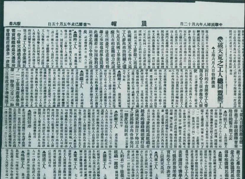 1919年6月3日以后,上海工人率先罢工,使五四爱国运动进入新的阶段。图为北京《晨报》关于上海六、七万工人总同盟罢工的报道。