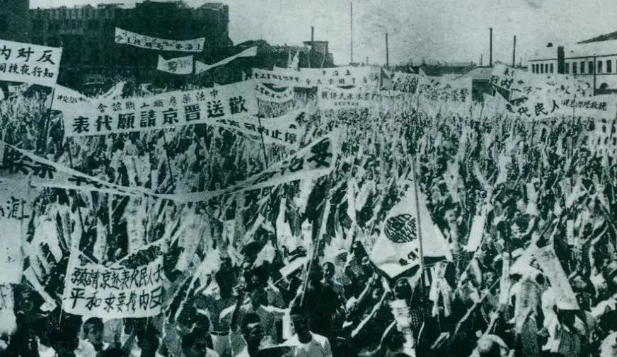 1946年6月23日,上海各界5万余人在北火车站广场召开欢送赴南京请愿代表的大会,呼吁和平,反对内战,并举行了示威游行。