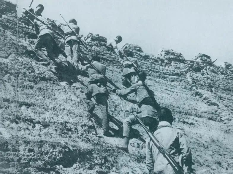 1945年6月25日,八路军冀中部队攻克河北献县。图为部队奋勇攀登城墙。