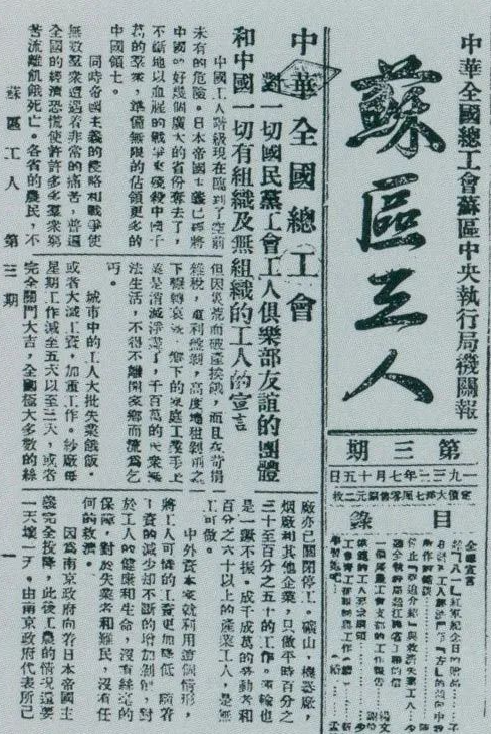 1933年7月15日,刘少奇在《苏区工人》报第三期上发表《停止“强迫介绍”与救济失业工人》和《模范的工人要求纲领》两篇文章。