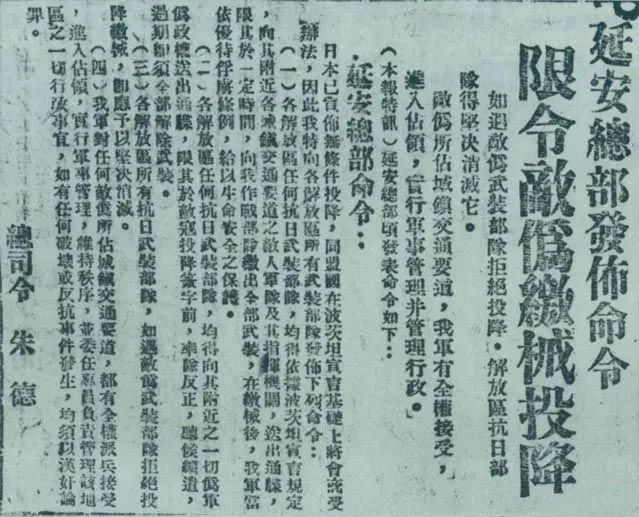 1945年8月10日,朱德发布命令,限令日伪军缴械投降。