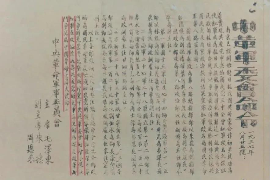 1937年8月25日,毛泽东和朱德、周恩来发出的关于红军改编为国民革命军第八路军的命令。
