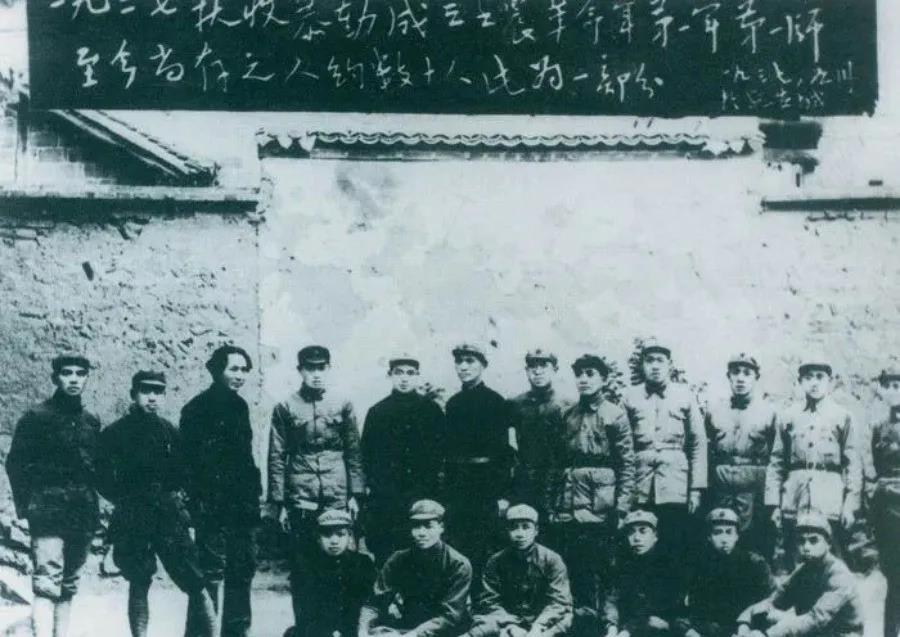 1927年9月9日,以毛泽东为书记的中共湖南省委前敌委员会,领导工农革命军第一师发动湘赣边界秋收起义。图为毛泽东在延安和当年参加秋收起义的部分同志合影。