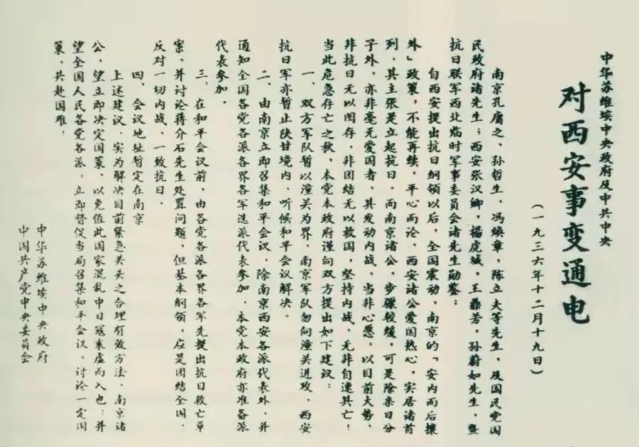 ◆1936年12月19日,中华苏维埃中央政府和中共中央发表主张和平解决西安事变的《通电》。