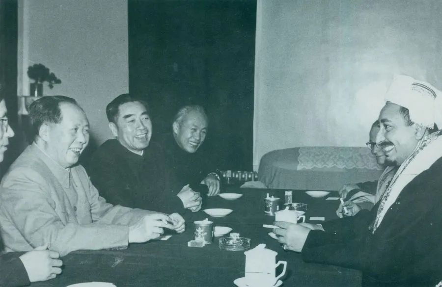 ◆1958年1月3日,周恩来陪同毛泽东在杭州会见也门王国副首相兼外交大臣和国防大臣巴德尔王太子(右一)及其随行人员。