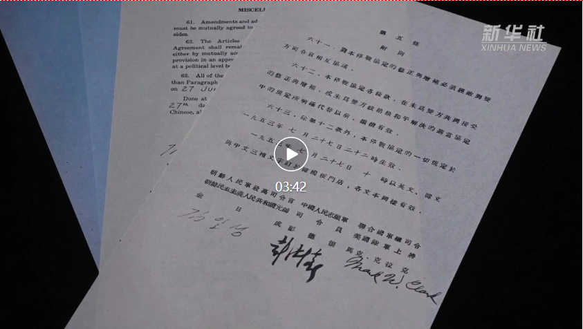 1953年7月27日,《朝鲜停战协定》在板门店落笔签订。为历时两年零九个月的抗美援朝战争画上句点。历经两年158轮会谈,用时仅10分钟的板门店签字,宣告了抗美援朝战争的伟大胜利。