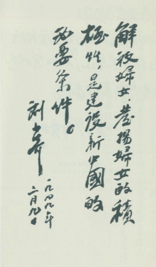◆1949年2月9日,刘少奇为中国妇女第一次全国代表大会题词。