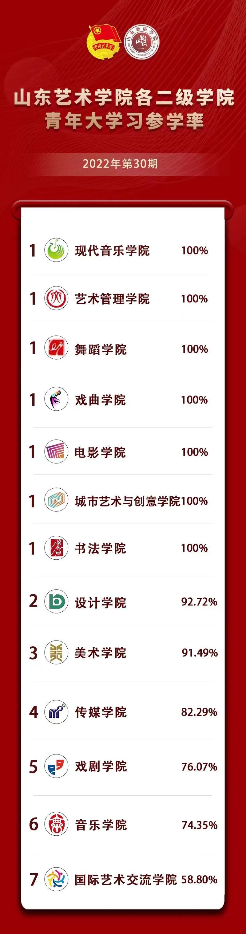 在2022年第30期中,现代音乐学院、艺术管理学院、舞蹈学院、戏曲学院、电影学院、城市艺术与创意学院、书法学院参学率达到了100%,对上述七个学院提出表扬,希望不断总结经验,持续发力,保持良好态势。
