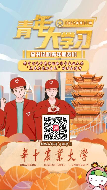本周我们将与大家一起学习青年大学习2022年第31期学习习近平总书记给华中农业大学“本禹志愿服务队”的回信精神